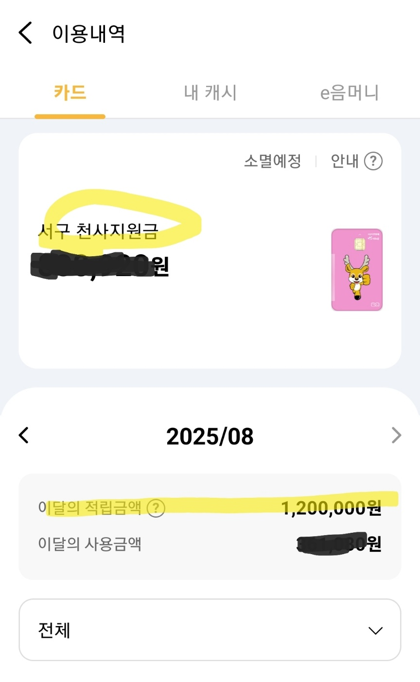 지급되면 문자로 알려줍니다. 인천 이음카드 어플에서 적립금액 알 수 있어요. 이미지에 노란색으로 밑줄 친 내용이 120만원 적립되었다는 내용이에요.