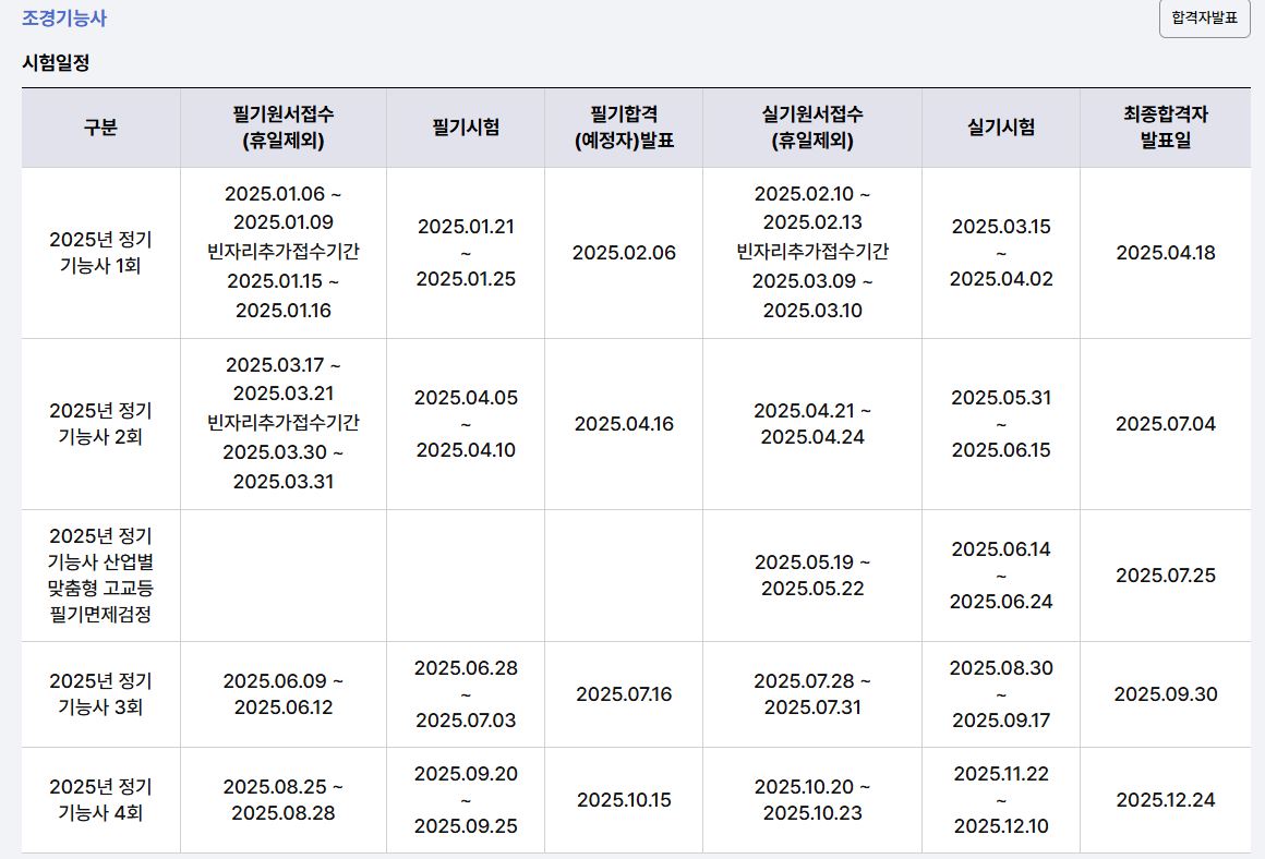 | 회차 | 필기 접수 | 필기 시험 | 필기 합격 발표 | 실기 접수 | 실기 시험 | 최종 합격 발표 |